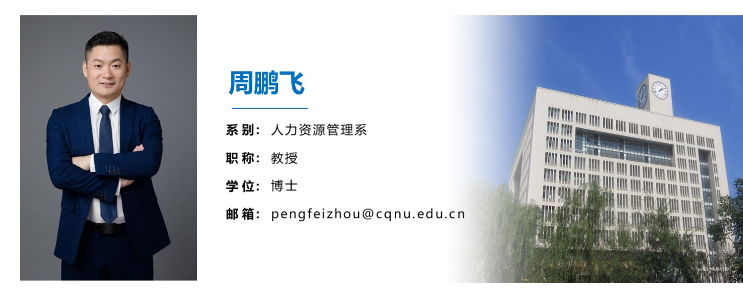 周鹏飞,1979年生,男,汉族,湖南长沙人,博士,教授,硕士生导师,重庆师范大学博望学者领军人才,教学名师,人力资源管理系系主任,中国人口学会理事,重庆市区域经济学会理事,中国能源研究会智慧能源与产业零碳化发展专业委员会委员,工信部产业实践教授、教育部学位中心论文评审专家。主要研究领域为人口经济学、农业经济学、产业组织与管理。主持国家社科基金、教育部产学协同育人项目、重庆市社科规划项目等科研课题15项,主研国家级、省部级和校级课题30余项,以第一作者或通讯作者在《宏观经济研究》《城市发展研究》《税务研究》等重要期刊上发表论文40余篇。研究咨政报告被商务部等政府部门和研究机构采纳6次,学术论文入选全国哲学社会科学工作办公室优秀成果选编。出版学术专著1部,主编教材2部,副主编及参编教材6部。指导学生参加国家级、市级比赛获奖20余次,多次荣获重庆师范大学“教学优秀奖”、“优秀教师”、“师德标兵”、“本科生优秀导师”等称号。长期为本科生和研究生讲授《跨专业实训》《组织行为学》《人力资源管理》《劳动经济学》《农村公共管理》等相关课程。