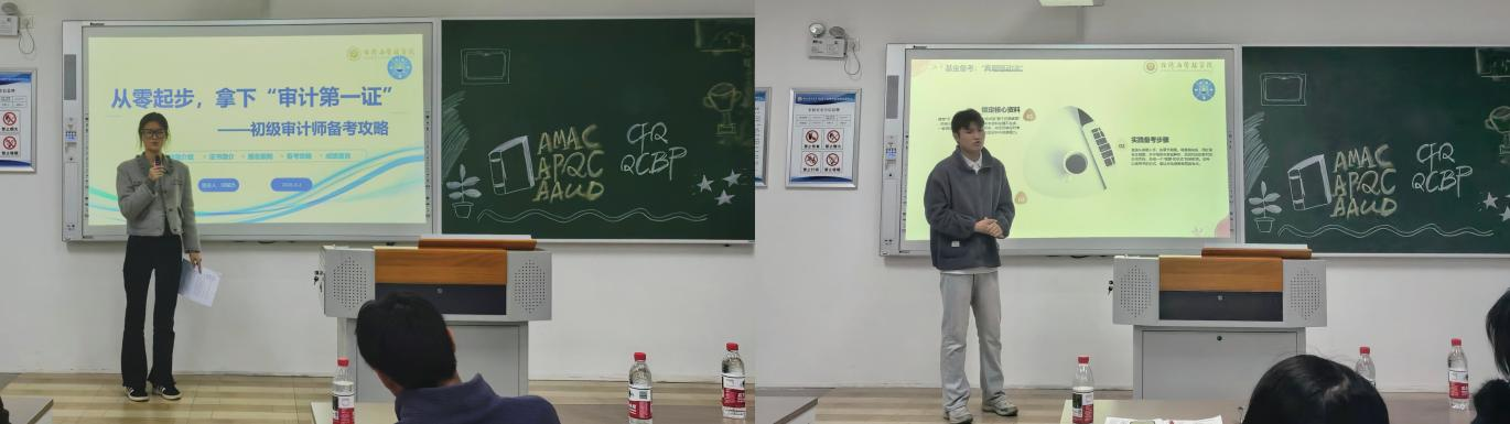 在初级会计证书板块,2024级财务管理专业薄航袁、郭知涵两位同学系统讲解了考试注意事项、备考方法、资料推荐、重点知识及答题技巧,并分享了保持备考动力的实用建议。2023级经济学专业邓斌杰同学结合自身经历,深入解读初级审计师证书的考试核心内容,树立了时间安排、做题策略、心态调整及成绩查询等关键环节。