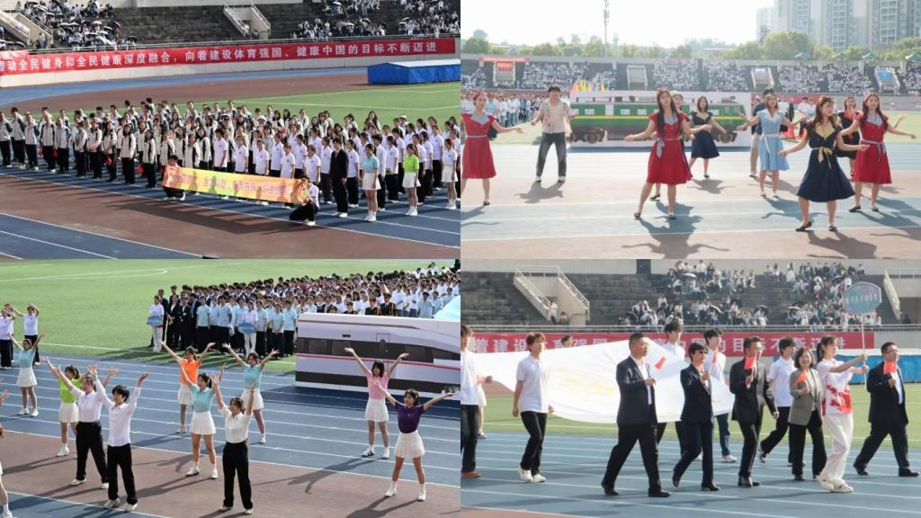 方阵步伐整齐、口号嘹亮。表演方队以“绿皮火车”到“高铁”的时代变迁为创意,融合专业特色与艺术表现,展现了91视频