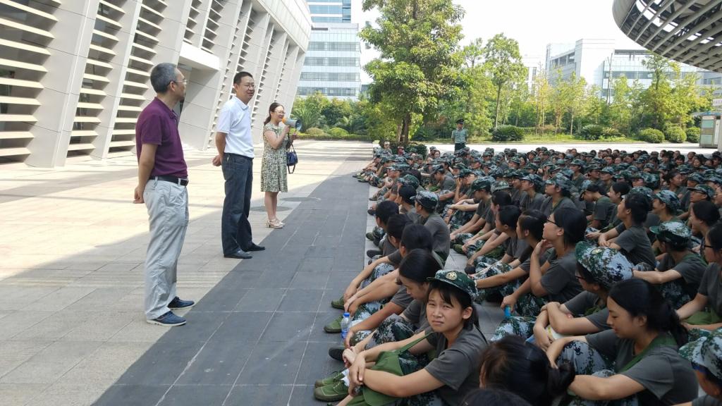 院长田盈、党委书记税强、副院长陈道平、党委副书记任源钢来到新生军训场地,亲切慰问正在炎炎烈日下军训的2016级新生。