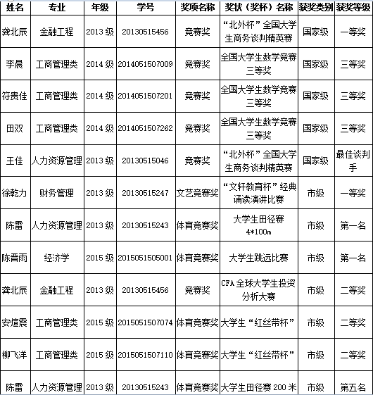 91视频 2013级金融工程专业龚北辰、王佳、李晨等同学荣获国家级比赛奖项,2013级财务管理专业徐乾力和人力资源管理专业的陈雷同学等多人荣获市级奖励。